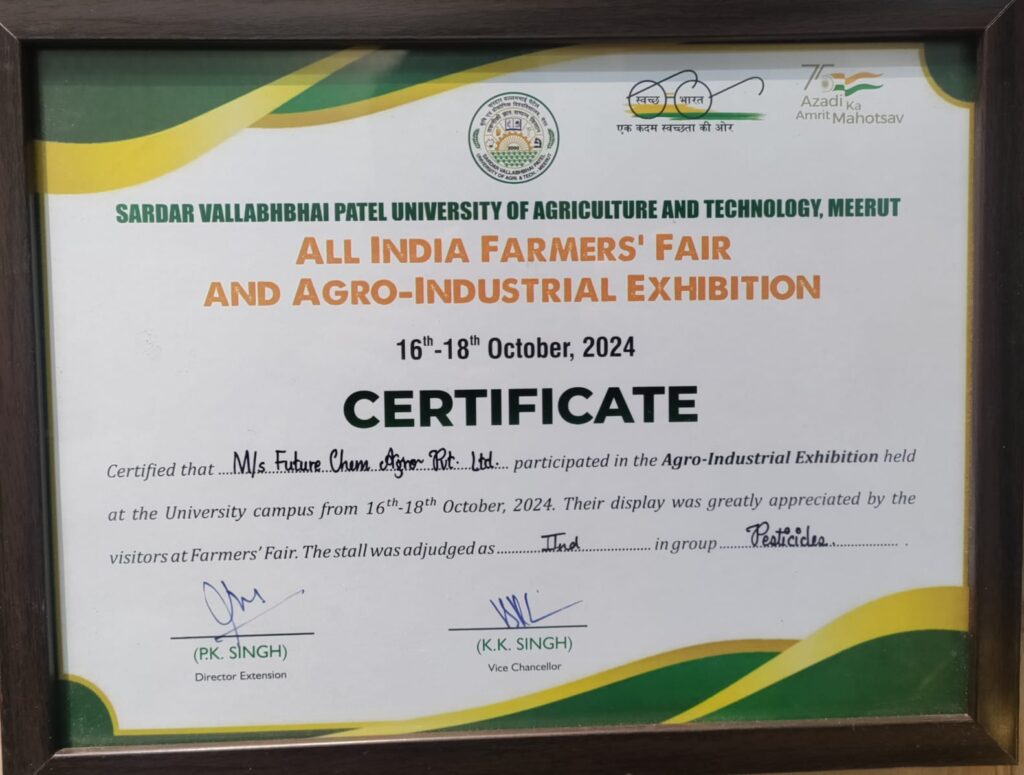 We are thrilled to share that we have earned the prestigious 1st Runner-Up Award (Certificate & Trophy) at the All India Farmers Fair & Agro-Industrial Exhibition, held from 16th to 18th October 2024 at Sardar Vallabhbhai Patel University of Agriculture & Technology, Meerut, U.P.
